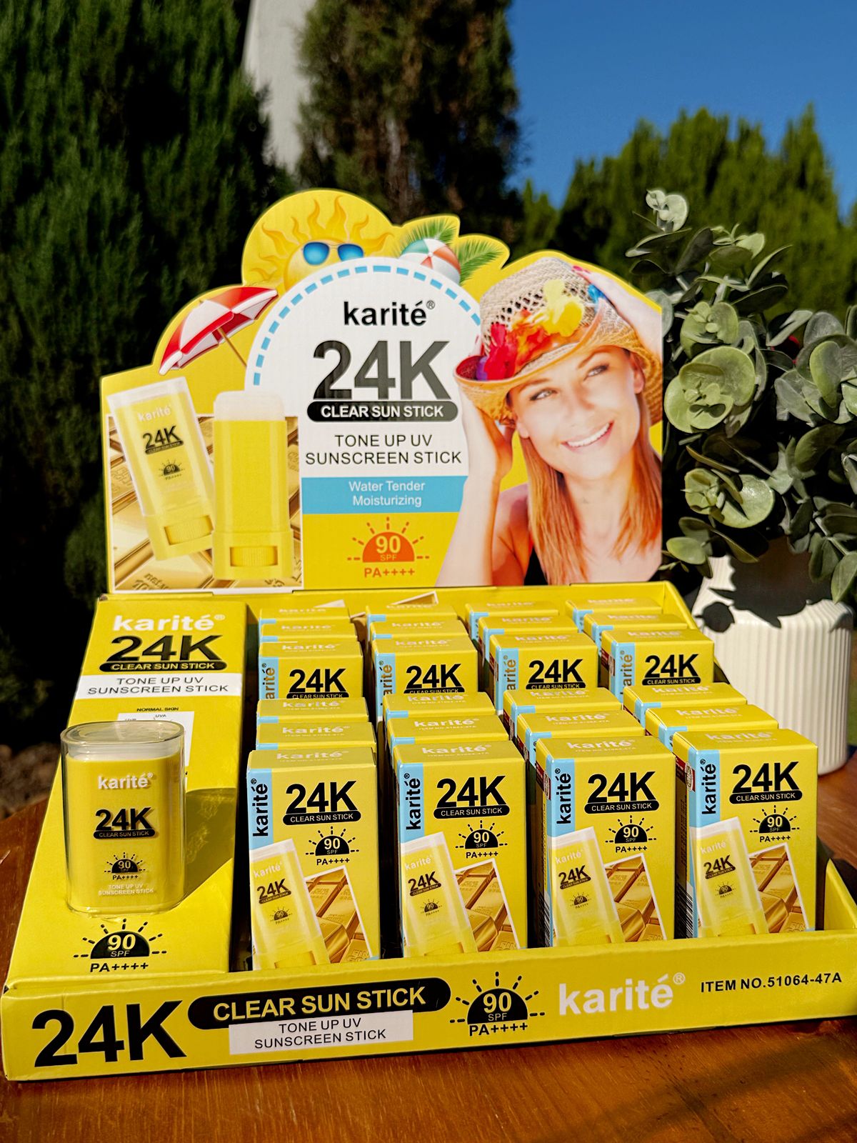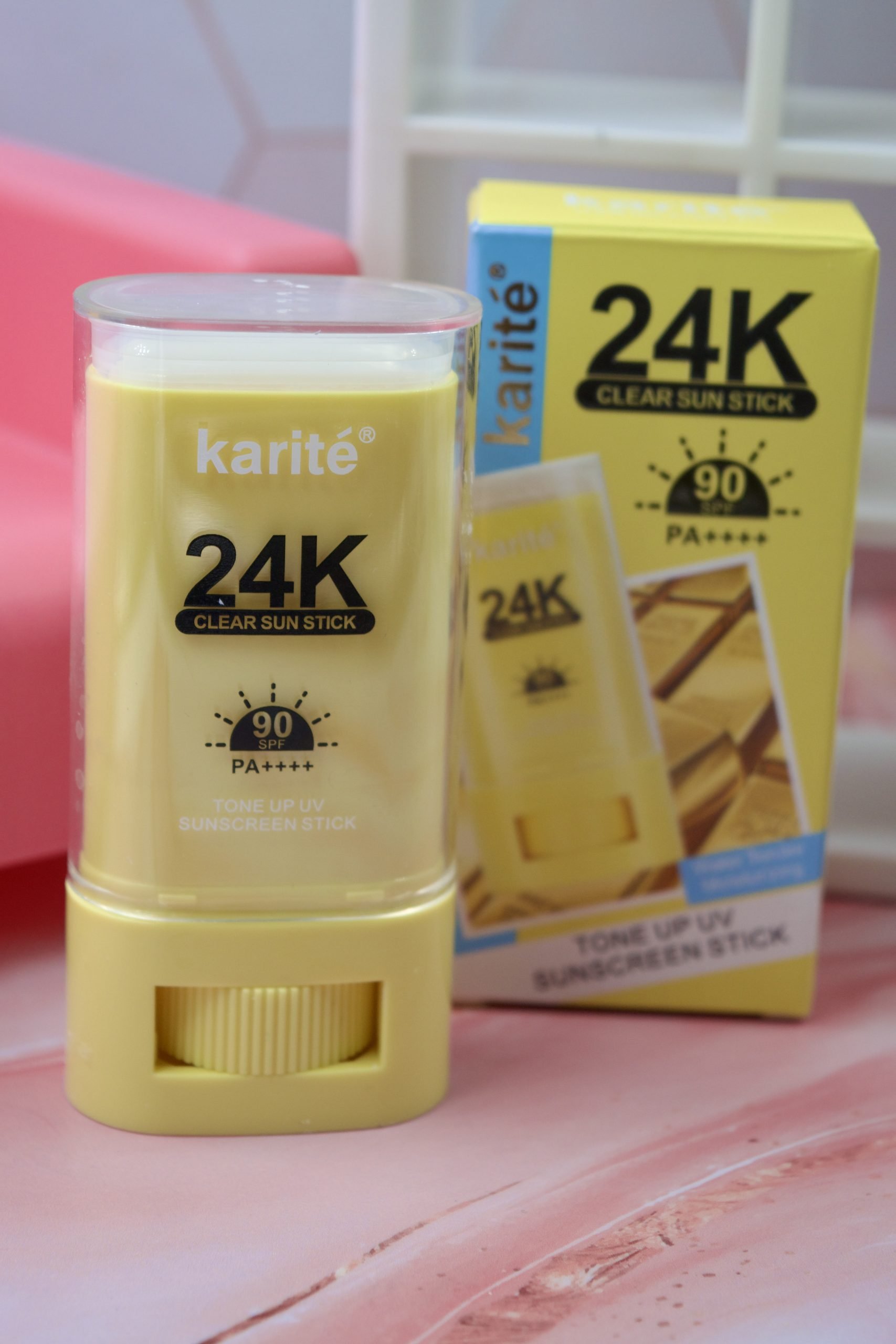 Karité 24K Clear Sun Stick SPF 90 PA++++, un protector solar en barra con las siguientes características clave: Alta Protección Solar: Ofrece un SPF 90 y PA++++, brindando una potente defensa contra los rayos UVA y UVB. Fórmula Enriquecida: Contiene oro de 24K, conocido por sus propiedades antioxidantes y capacidad para iluminar la piel. Textura y Acabado: Posee una textura humectante, ligera y no pegajosa que no deja residuos blancos ni sensación grasosa, y se absorbe fácilmente. Formato Conveniente: Su presentación en barra lo hace práctico para llevar y aplicar en cualquier momento y lugar, incluso sobre el maquillaje, sin correrlo. Beneficios Adicionales: Ayuda a unificar el tono de la piel, la hidrata y actúa como barrera contra el polvo y la contaminación ambienta
