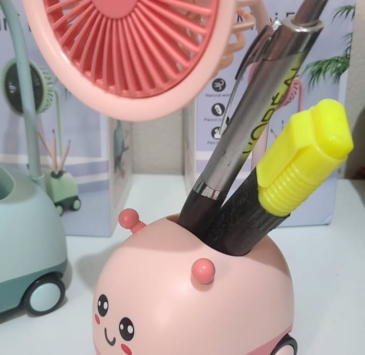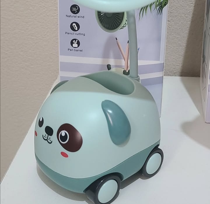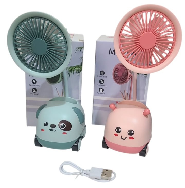 Mini ventilador recargable por USB con diseño de animalitos móvil, porta lápices y sacapunta incorporado. Todo en uno- también útil para adorno del hogar-