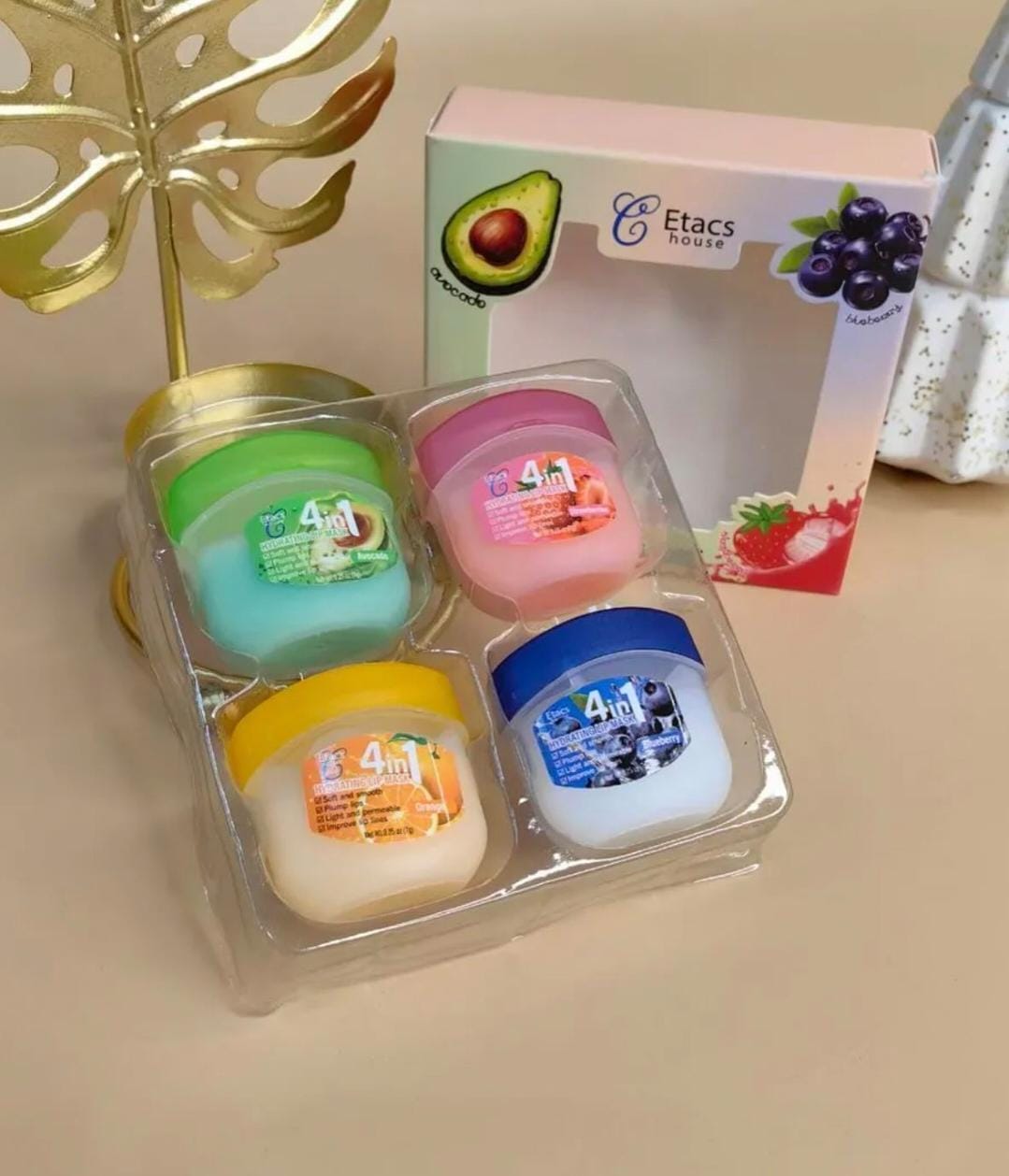 Mima tus labios con nuestro delicioso Kit de Vaselina 4 en 1, que combina cuidado intensivo con sabores tentadores. Ideal para mantener tus labios suaves, protegidos y con un toque de dulzura durante todo el día.