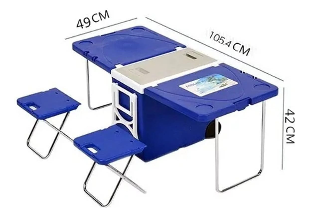 Viene con ruedas y manija para su fácil transporte, incluye dos banquetas y dos "mesitas" que le dan una excelente funcionalidad.