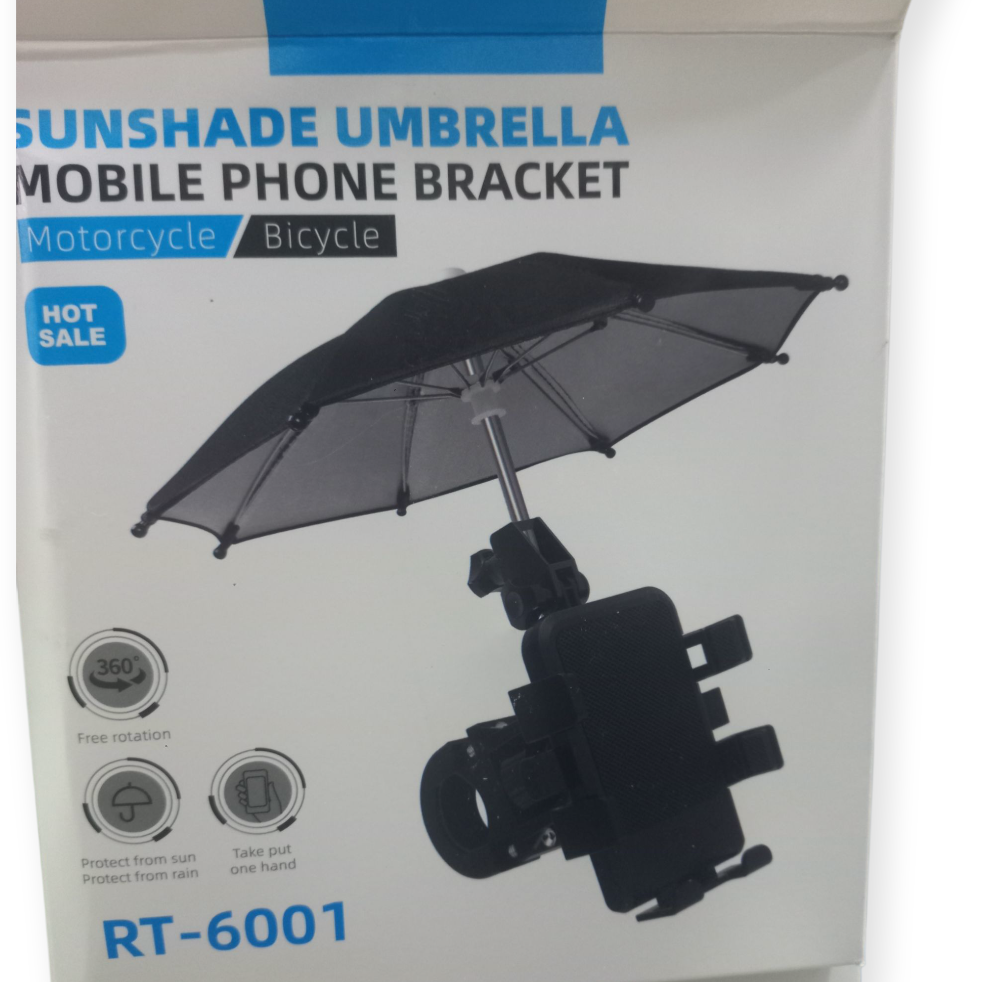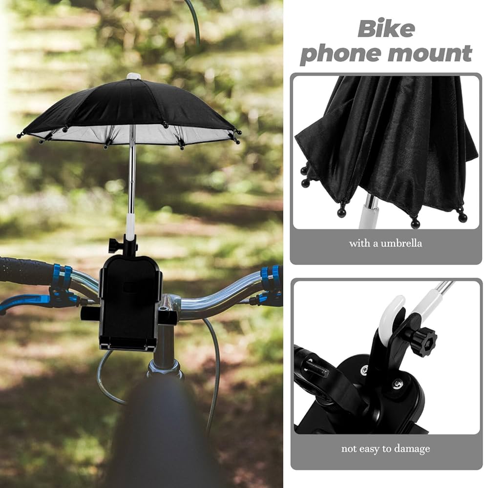 - Función dual: Actúa como un soporte de teléfono para el manillar y como un parasol o paraguas para proteger el dispositivo del sol y la lluvia.